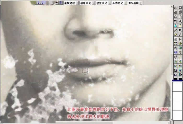 12.此图片最难处理的部分下巴,先将小的脏点漫漫处理掉再去处理比较大的脏块
